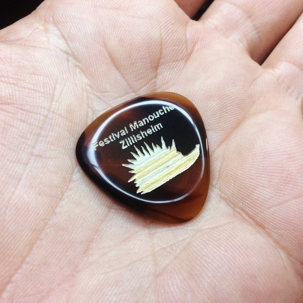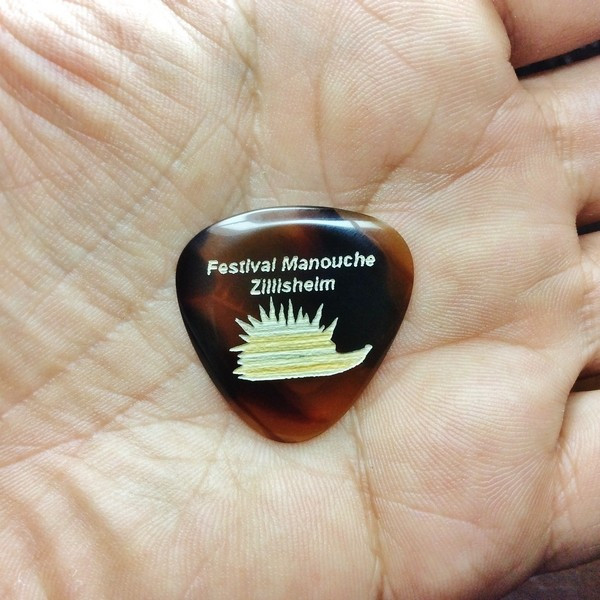 Plectre guitare ,modèle spécial Manouche 3 pointes, matière galalithe ,aussi appelée "Pierre de lait" ou "caséine".Gravure festival Manouche Zillisheim à l'avant et gravure arrière pour une bonne tenue en main.