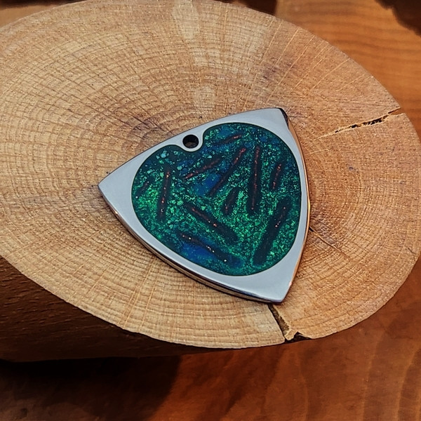 Matière moderne ,couleur laguna Dragon .Je garantie chaque plectre avec un minimum de dessin d'écaille dans la matière...Gravure arrière pour une bonne tenue en main.